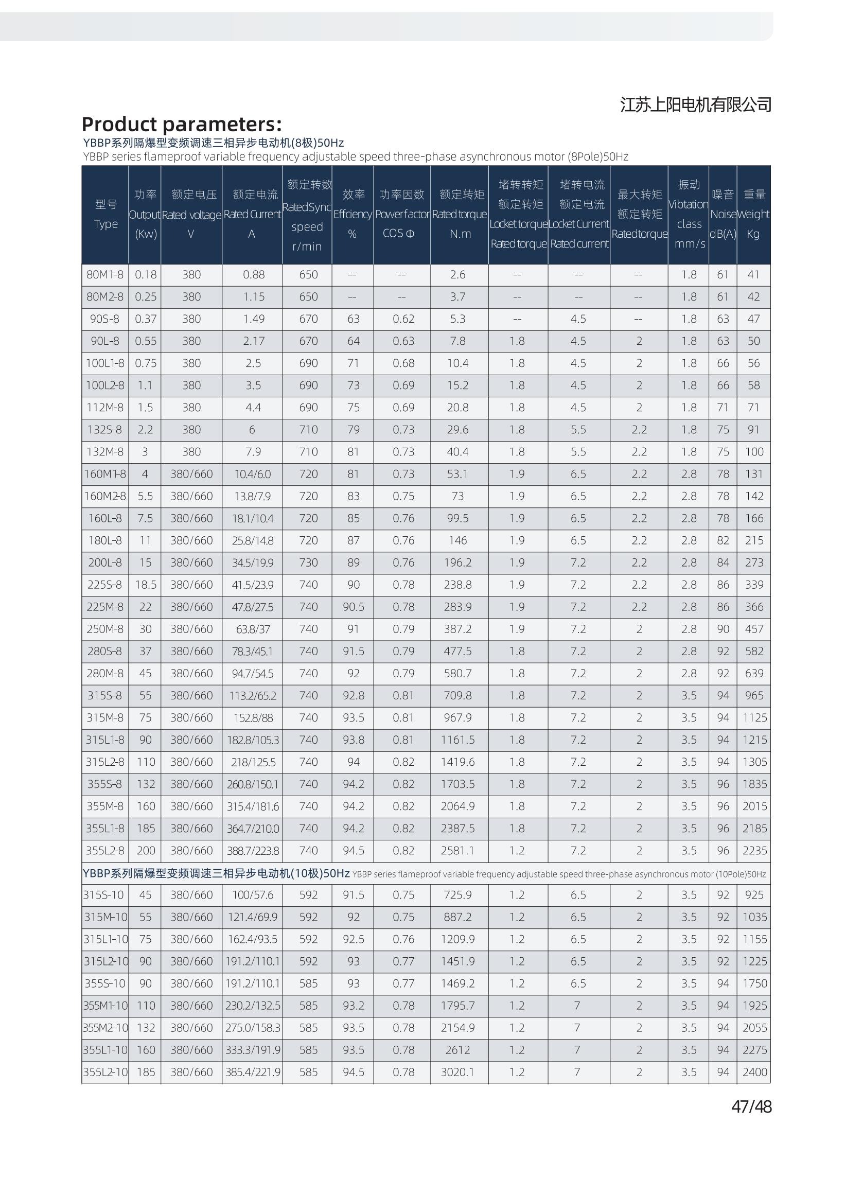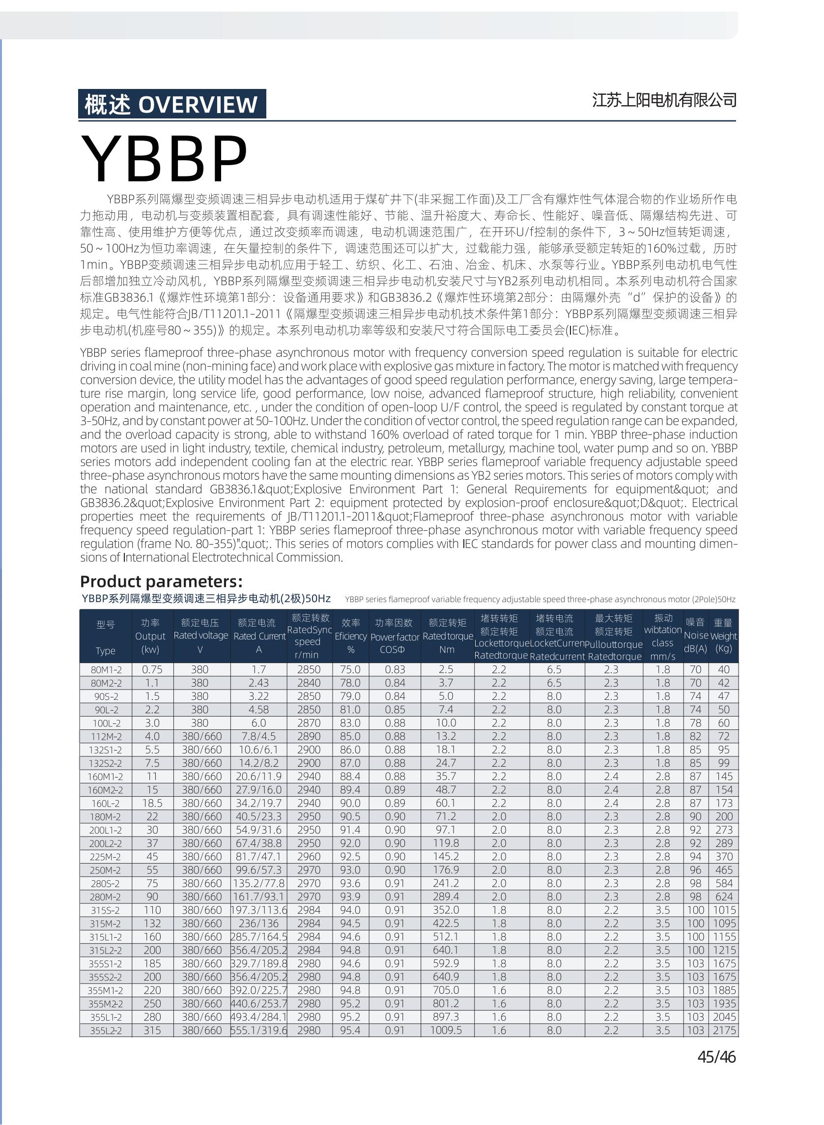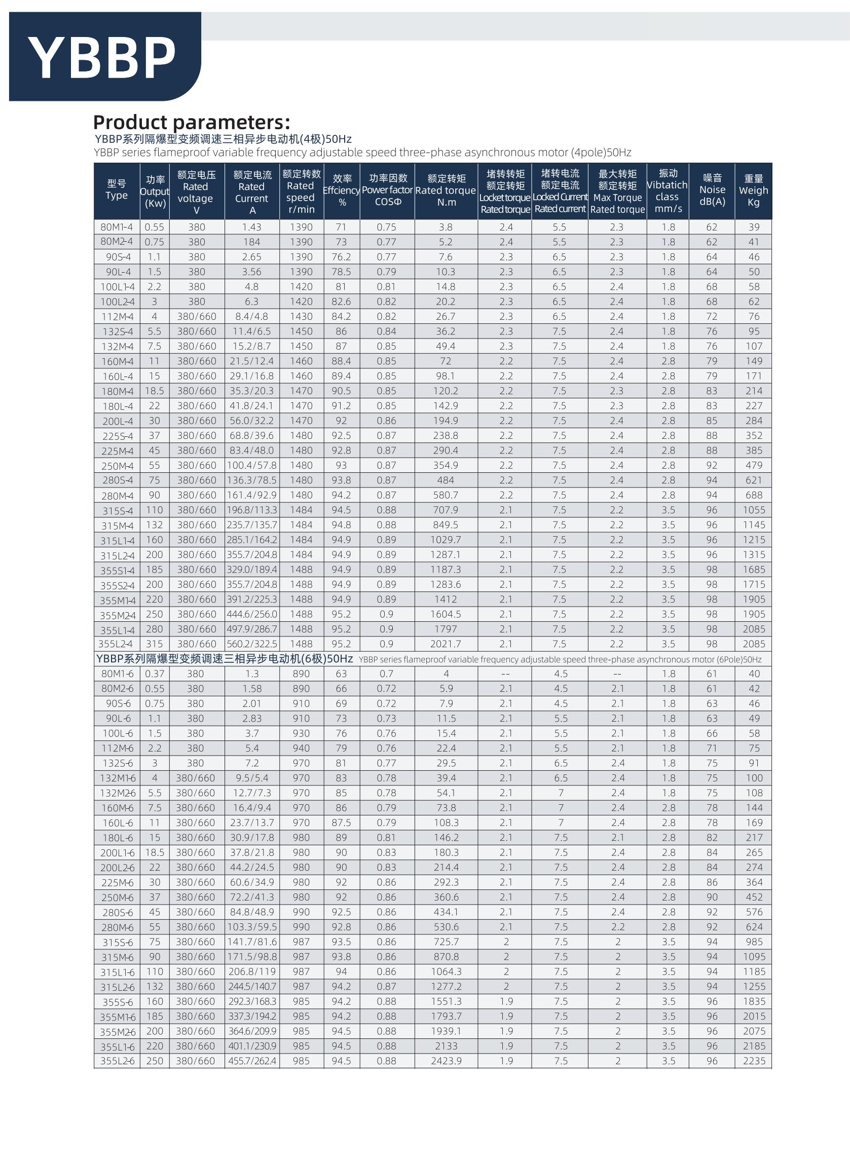 系列隔爆型變頻調(diào)速三相異步電動機適用于煤礦井下(非采掘工作面)及工廠含有爆炸性氣體混合物的作業(yè)場所作電力拖動用,電動機與變頻裝置相配套,具有調(diào)速性能好、節(jié)能、溫升裕度大、壽命長、性能好、噪音低、隔爆結(jié)構(gòu)先進(jìn)、可靠性高、使用維護(hù)方便等優(yōu)點,通過改變頻率而調(diào)速,電動機調(diào)速范圍廣,在開環(huán)U/f控制的條件下,3~50Hz恒轉(zhuǎn)矩調(diào)速,50~100Hz為恒功率調(diào)速,在矢量控制的條件下,調(diào)速范圍還可以擴大,過載能力強,能夠承受額定轉(zhuǎn)矩的160%過載,歷時1min。 YBBP 變頻調(diào)速三相異步電動機應(yīng)用于輕工、紡織、化工、石油、冶金、機床、水泵等行業(yè)。YBBP系列電動機電氣性后部增加獨立冷動風(fēng)機,YBBP系列隔爆型變頻調(diào)速三相異步電動機安裝尺寸與YB2系列電動機相同。 本系列電動機符合國家標(biāo)準(zhǔn)GB3836.1《爆炸性環(huán)境 第1部分:設(shè)備 通用要求》和GB3836.2《爆炸性環(huán)境 第2部分:由隔爆外殼“d”保護(hù)的設(shè)備 》的規(guī)定電氣性能符合JB/T 11201.1-2011《隔爆型變頻調(diào)速三相異步電動機技術(shù)條件 第1部分:YBBP系列隔爆型變頻調(diào)速三相異步電動機(機座號80~355)》的規(guī)定。本系列電動機功率等級和安裝尺寸符合國際電工委員會(IEC)標(biāo)準(zhǔn)